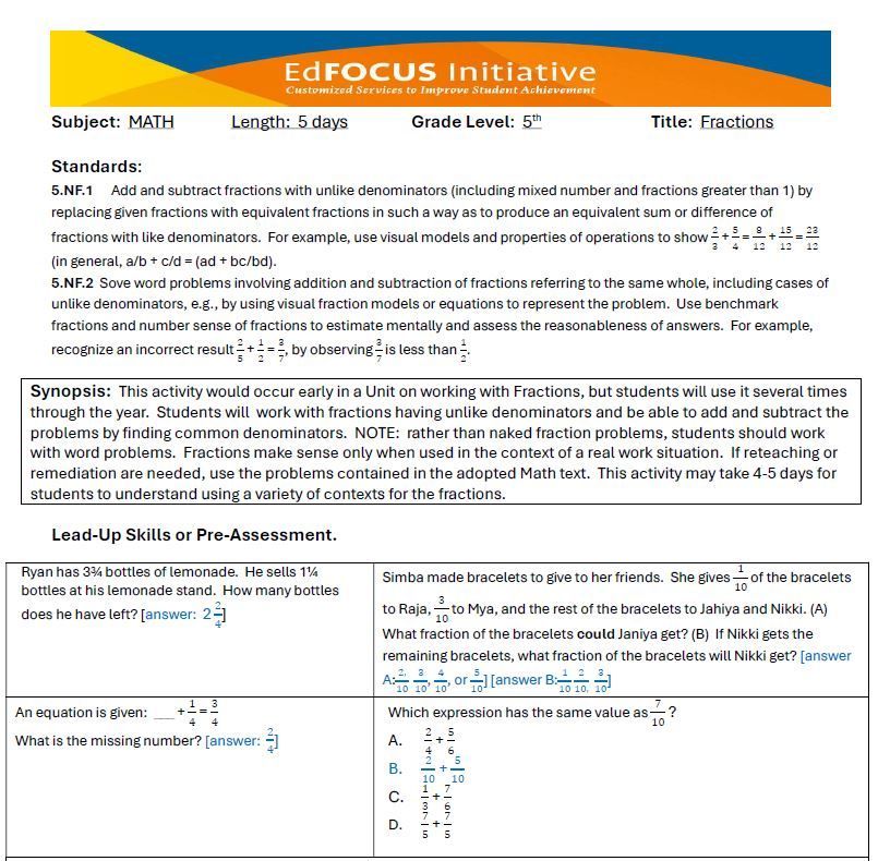 Lead-up Skills / Preassessment: Lead-up skills are listed to help teachers identify any missing readiness skills students may need to attempt the standards in this Activity. The sample preassessment contains word problems with fractions.