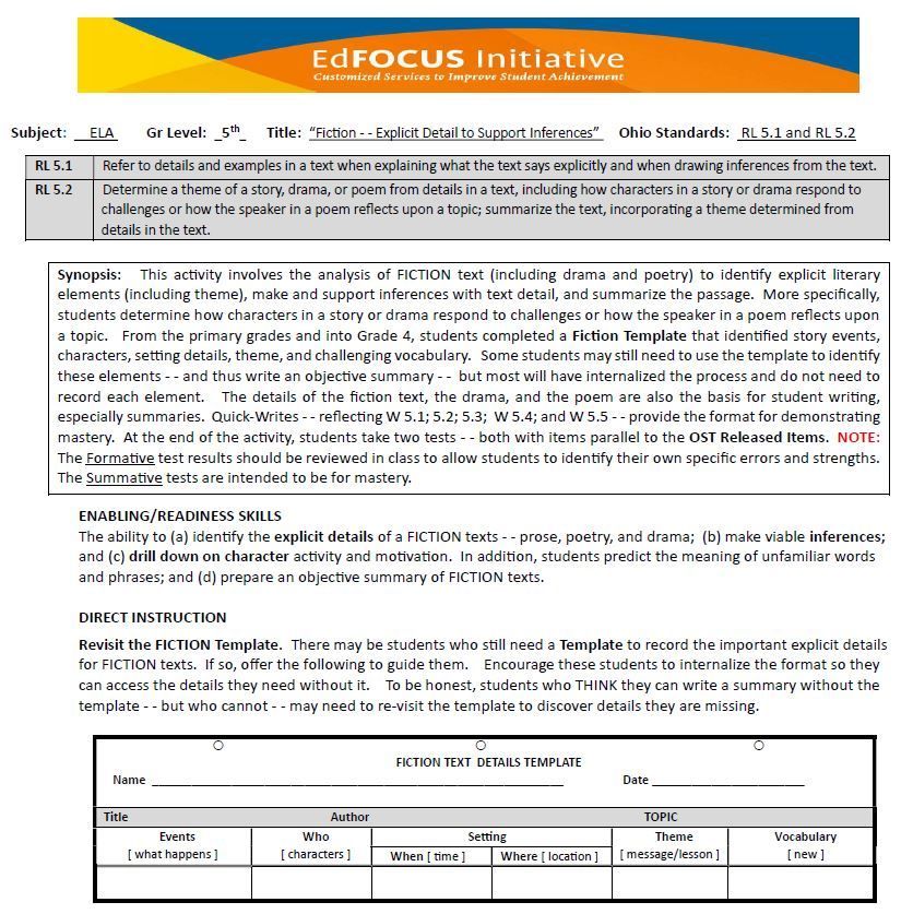 Direct Instruction: Suggested teaching strategies are given that model for students what they need to do to begin their journey toward mastery. These strategies include independently using a Template to record text details; learning to make viable inferences from text detail - - and vice versa; and explaining how a character responds to the challenges faced (or a poet reflects on the topic of the verse. Several texts (prose, drama, and poetry) are provided for students to practice and construct meaning for themselves.