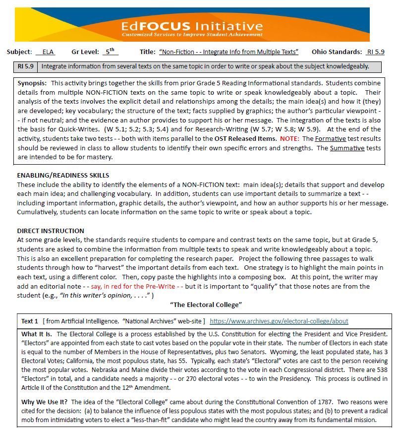 This ACTIVITY has a set of teaching-learning strategies proven to increase student mastery of an important standard - - integrating information from two texts on the same topic. Student text analysis reveals explicit detail and relationships among the details; the main idea(s) and how it (they) are developed; key vocabulary; the structure of the text; facts supplied by graphics; the author’s particular viewpoint - - if not neutral; and the evidence an author provides to support his or her message. The integration of the texts is also the basis for Quick-Writes. (W 5.1; 5.2; 5.3; 5.4) and for Research-Writing (W 5.7; W 5.8; W5.9). At the end of the activity, students take two tests - - both with items parallel to the OST Released Items. [At Grades K-5, each Activity attaches student-sized texts, templates, and test items that teachers can quickly print and use immediately in class.]